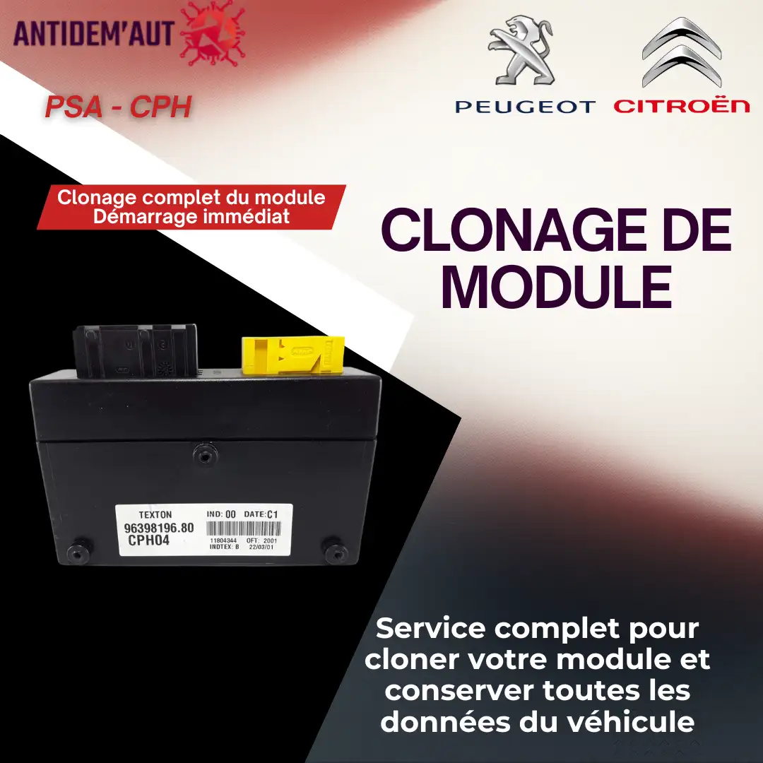 Clonage boîtier CPH Peugeot/Citroën (anciens modèles) : transfert intégral des données vers boîtier identique, prêt à remonter. Colis assuré A/R, traitement 24–48 h.