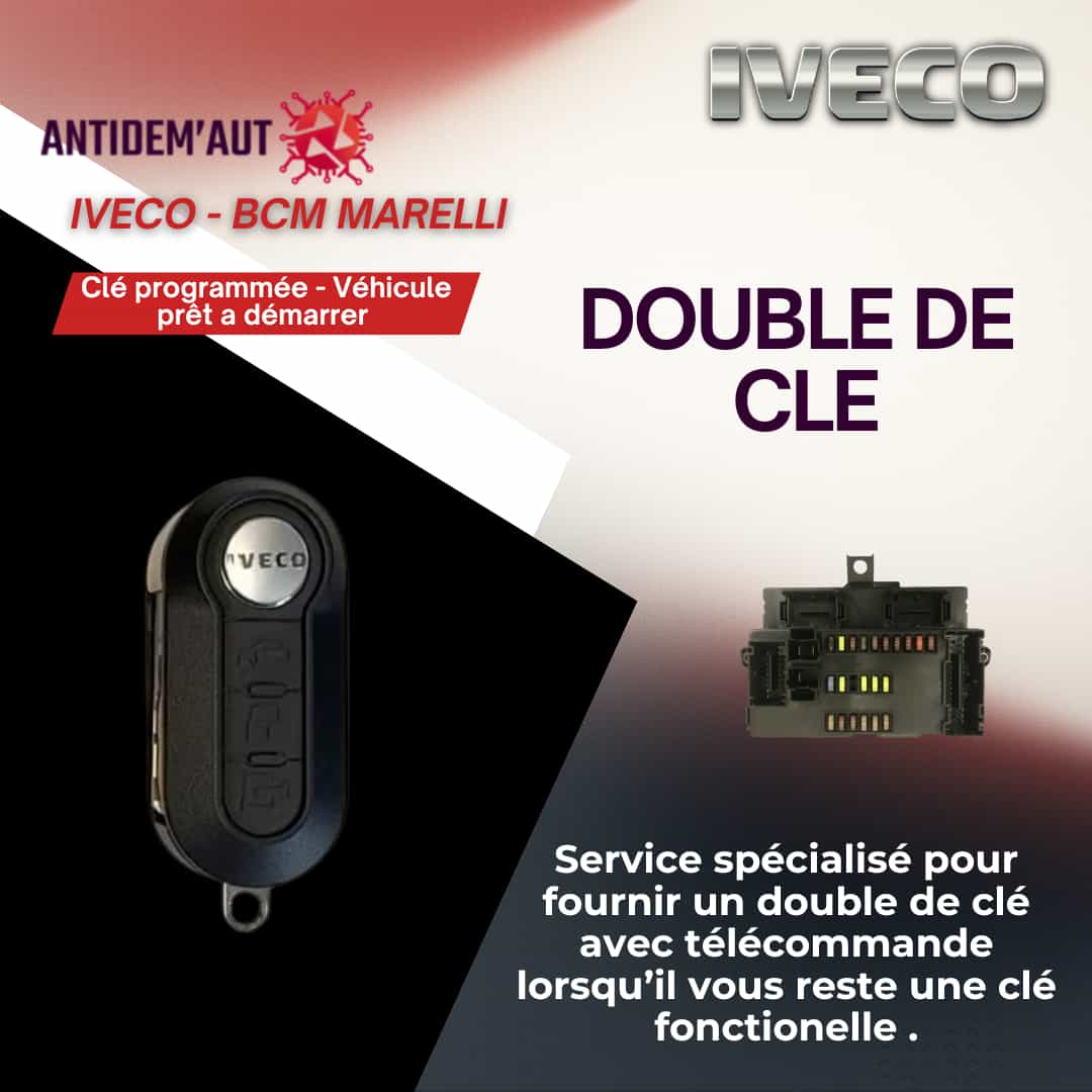 Ce service permet de réaliser un double de clé de voiture pour un véhicule IVECO équipé d’un BCM Magneti Marelli, en programmant une nouvelle clé télécommande complète.