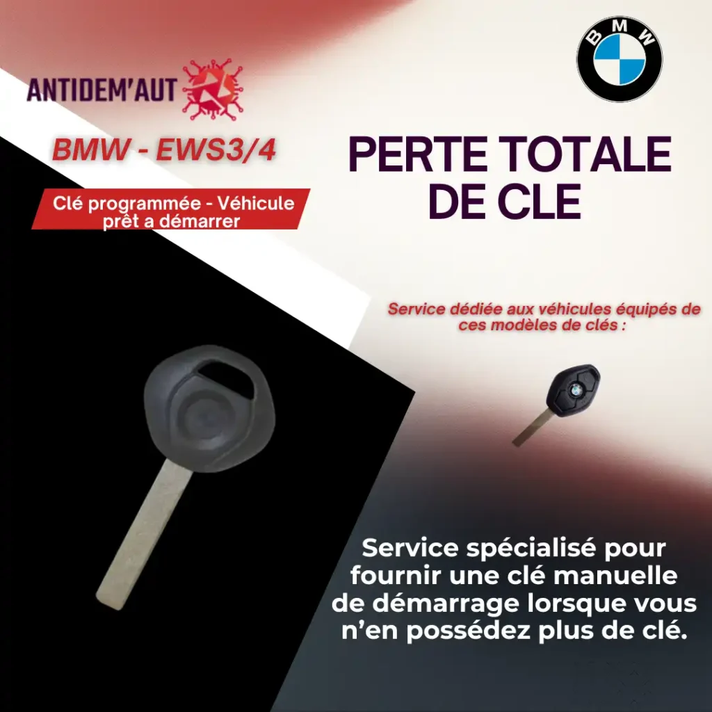 Perte totale de clé BMW EWS3 / EWS4 : solution professionnelle pour refaire une clé de voiture Refaire une clé de voiture sur une BMW équipée d’un système EWS3 ou EWS4 devient indispensable lorsque toutes les clés ont été perdues. Dans ce cas précis de perte totale de clé, le véhicule ne reconnaît plus aucun transpondeur valide et l’anti-démarrage empêche tout démarrage. Le système EWS3 / EWS4 permet la création d’une clé simple avec transpondeur, sans télécommande, parfaitement fonctionnelle pour démarrer le véhicule. Cette prestation est exclusivement dédiée aux situations où il n’existe plus aucune clé utilisable. Si vous souhaitez refaire une clé de voiture BMW EWS après une perte totale, ce service est spécifiquement conçu pour répondre à ce besoin.