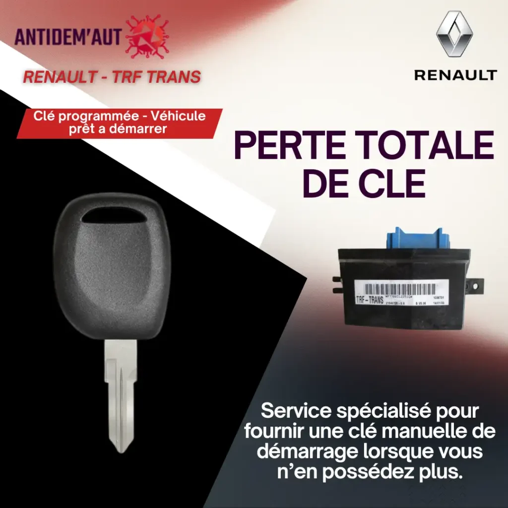 Vous avez besoin de refaire une clé de voiture Renault après une perte totale de clés sur un véhicule équipé du système antidémarrage TRF-TRANS-CAR ? Ce système ancien ne permet aucune programmation par valise constructeur. La seule solution fiable consiste à reconstruire intégralement l’accès mécanique et l’antidémarrage à partir des éléments d’origine. Nous proposons un service 100 % à distance, sans déplacement du véhicule, permettant de refaire une clé de voiture prête à démarrer, même lorsque plus aucune clé n’est disponible. Le système TRF-TRANS-CAR est un dispositif antidémarrage utilisé sur certains véhicules Renault entre 1997 et 2001. Il repose sur un boîtier indépendant qui dialogue avec un transpondeur passif intégré dans la clé. Caractéristiques principales :